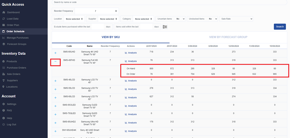 You can also click the + icon to expand the expected stock levels at each interval. This will show the stock on hand decrease as sales are made, then increase as purchase orders are received.