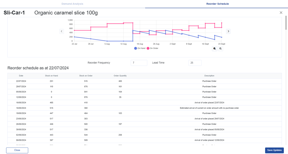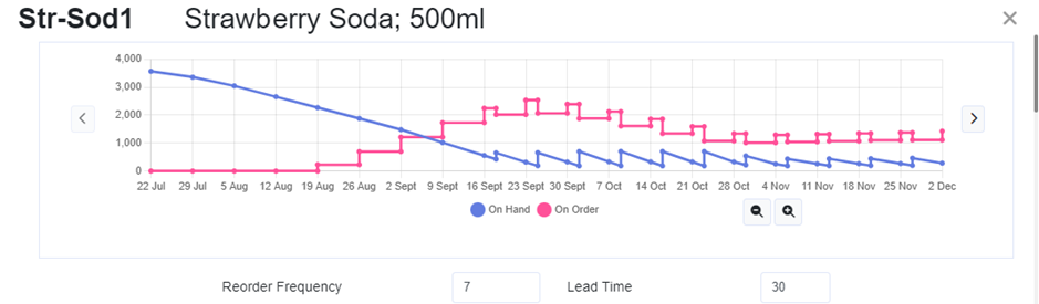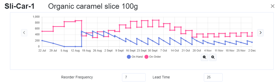 See a graphical representation of your expected stock levels for the next 12 – 24 months. This will show the expected stock on order (pink line) that you will have if you follow the system’s suggestions, increasing as you place your supplier orders, and decreasing as each order is received, depending on your configured reorder frequency and lead time.