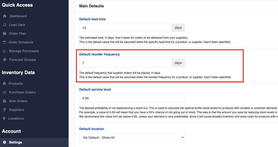 The reorder frequency is essentially how often you will place orders with your suppliers (in days). If this is always the same frequency in your business, you will only need to set this once – go to Settings -> Default Reorder Frequency. (Note that this will only appear after the order schedule is enabled as above)