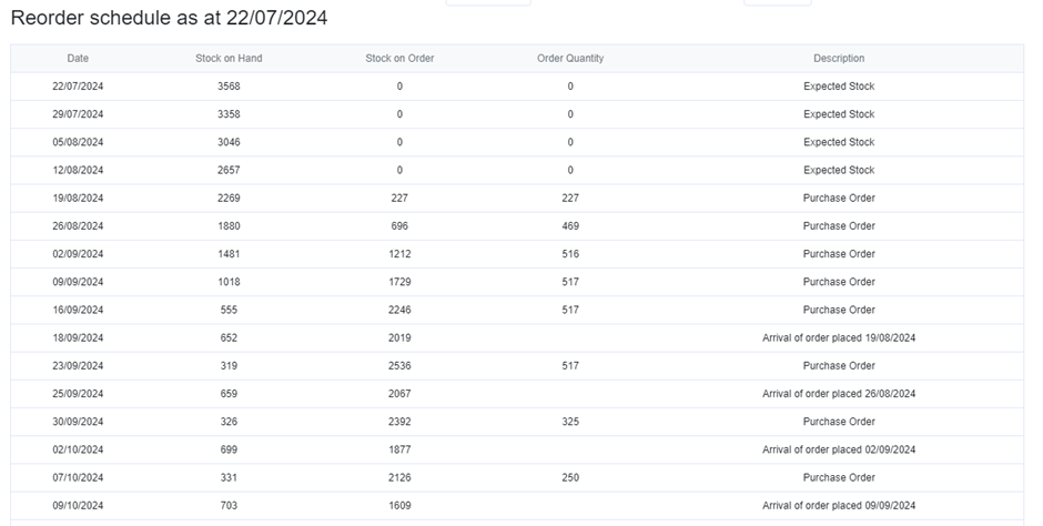- Expected stock: The expected stock level at each interval in the configured order frequency – this will show if no purchase orders are required to be made at that time.